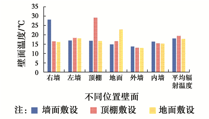 3) 外墙温度受室外环境影响较大。3种敷设方式外墙的温度均最低,且与其他壁面温度相差较大。