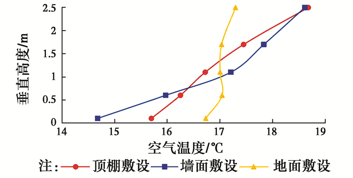 实验分别测试了距离地面垂直高度0.1、0.6、1.1、1.7、2.5 m处的室内温度,图 11为3种敷设方式空间垂直温度分布,由图可知:
