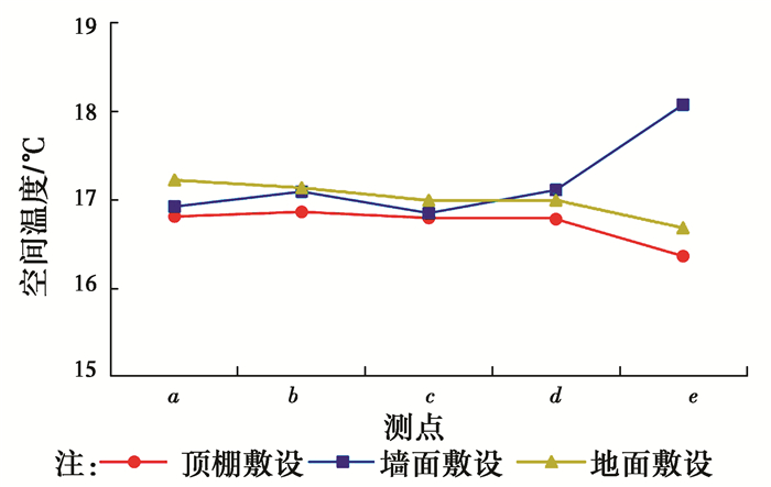 6) 墙面敷设供暖时,d、e点位于房间内区,并且内区的数据采集设备不断发热,故这两点温度较高,同时,由于实验期间实验人员坐在墙面敷设供暖房间的e点附近,因此,该点温度明显高于其他测点。