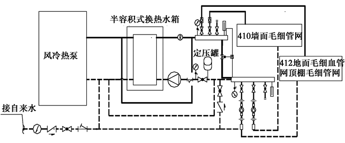实验系统冷热源采用空气源热泵机组,冬季利用空气源热泵机组制取45 ℃的热水,45 ℃的高温热水通过换热水箱温度降为35 ℃,供给毛细管网末端,毛细管网管路的供水温度通过换热水箱上的比例积分调节阀进行控制。原理如图 2所示。