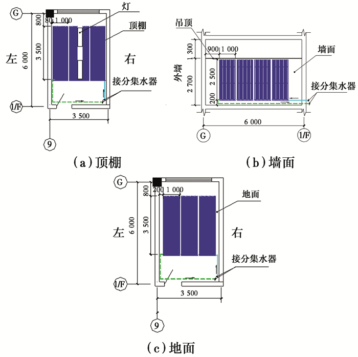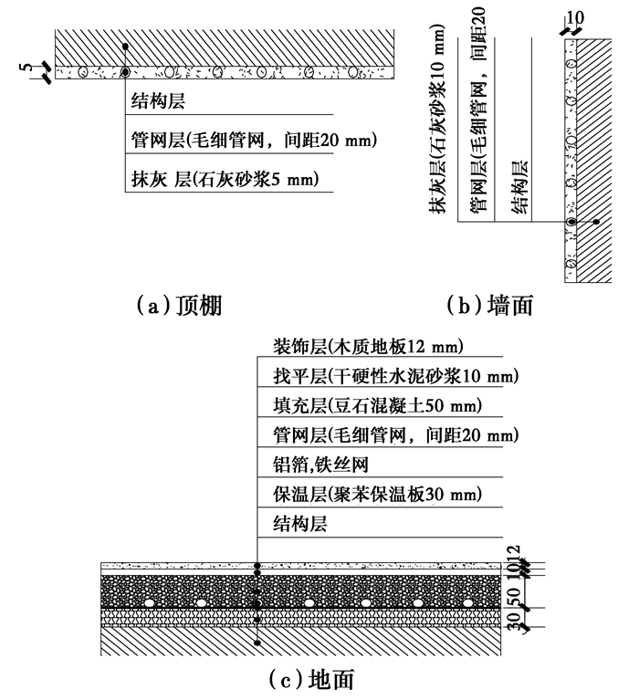 现有研究均是通过模拟与理论计算对毛细管网不同敷设方式进行供暖研究,或是仅对单一敷设方式进行模拟实验分析,并没有通过实验对毛细管网不同敷设方式进行供暖研究。通过35 ℃供水温度下顶棚、墙面、地面3种敷设方式供暖的实验,从室内空气温度、辐射表面温度、其他壁面温度等角度全面分析不同敷设方式下毛细管网供暖的舒适性。