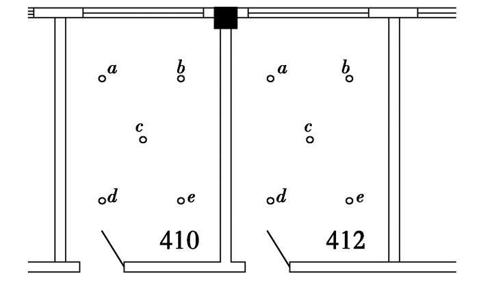 2) 空间测点布置 空间测点在a、b、c、d、e5个温度测点位置,距地0.1 m(脚踝)、0.6 m(膝盖)、1.1 m(坐姿头顶)、1.7 m(站姿头顶)、2.5 m(房间上部)处布置温度测点,故空间共布有25个温度测点。