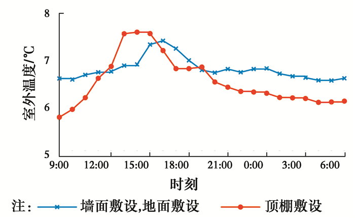 辐射表面平均温度与毛细管网构造层存在密切联系。顶棚、墙面、地面3种敷设方式中,地面毛细管网的构造层最厚,墙面次之,顶棚最薄。图 9为3种敷设方式供暖辐射表面逐时温度,由图 9可知: