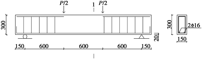 试验设计了4根轻骨料混凝土梁,长度为2 100 mm,截面尺寸为150 mm×300 mm。其一为素轻骨料混凝土梁,编号LC-0,其余3个均为塑钢纤维轻骨料混凝土梁,编号分别为LC-3、LC-6、LC-9,即纤维掺量分别为3、6、9 kg/m3。试验所有试件配筋形式相同,受拉纵筋为2 16,架立筋为2φ8(不贯通);箍筋为φ6@120,保护层厚度为20 mm。具体配筋如图 1所示。