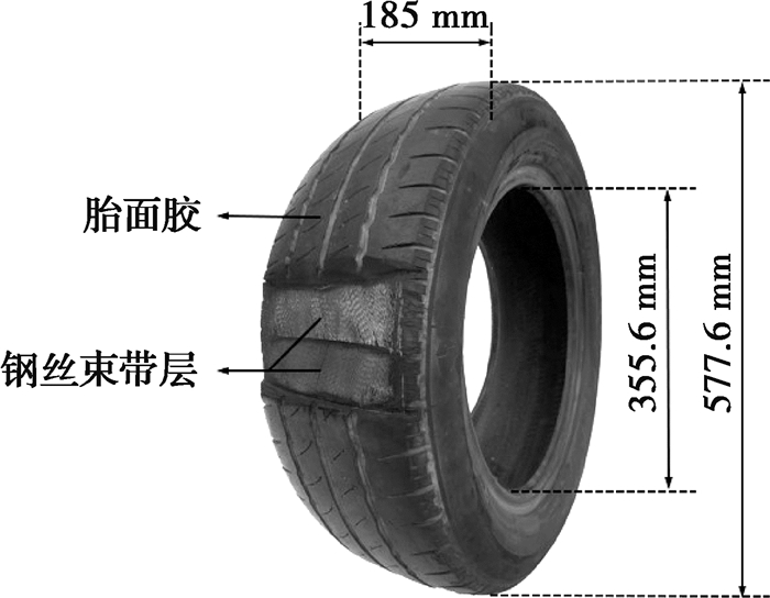 共设计两类试验:橡胶轮胎条拉伸试验和橡胶轮胎—砂土复合体轴压试验。试验所用轮胎为废弃橡胶轮胎,外径577.6 mm,内径355.6 mm,胎面高度185 mm,橡胶轮胎内部含有钢丝带束层,构造如图 2所示。