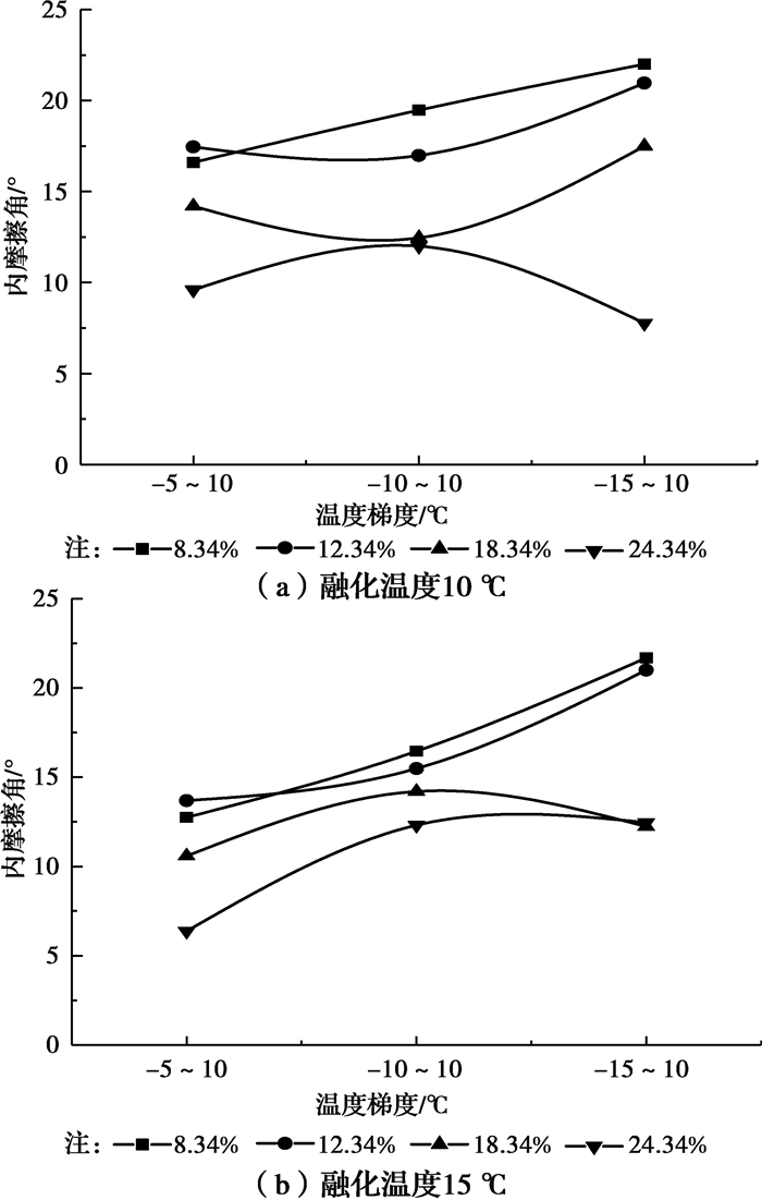 图 3为不同含水率下的黏聚力变化曲线。图 3(a)中,当含水率为24.34%、温度梯度为-15~10 ℃时,黏聚力下降到极值9.8 kPa。究其原因,高含水率试样在较大冻结温度作用下,土颗粒被较厚的冰包裹,融化后的土颗粒之间进行重组,且冻融后试样密度比未冻融密度小0.03 g/cm3,密度对较高饱和度试样的黏聚力变化规律有一定影响。表现为土体越密实,饱和度对土体黏聚力的影响越明显。