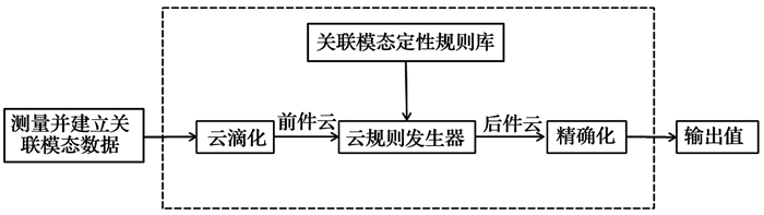 式中:刚度联系矩阵可表示为A=[a1, a2, …,am]的形式,其中ai为第i根杆件的单元刚度联系向量;m为结构杆件总数。与基于残余力的方法相比,关联模态指标是仅与结构振型相关的参数,通过刚度联系矩阵的转换后则会产生对应杆件的计算值,故可采用关联模态指标作为云推理参数。将残余力指标替换为关联模态指标并重新建立云推理系统,详见图 1,图中的关联模态数据可利用式(18)并结合测量模态数据来获取。主要变化是利用关联模态指标构建前件规则库,利用损伤程度区间模式建立后件规则库,两者匹配组成新的定性规则库,并将测量的模态数据转化为关联模态数据作为输入值。该方法避免了残余力的近似求解问题,故具有更高的可靠性。该方法可简称为关联模态云推理算法。