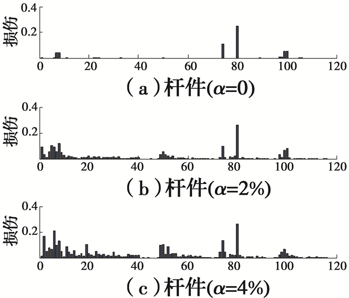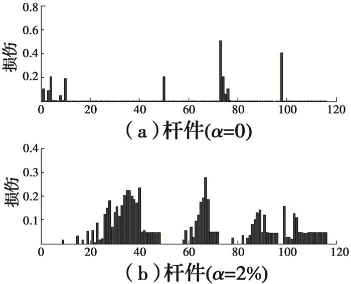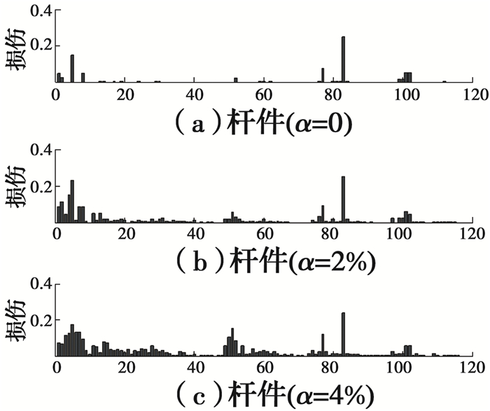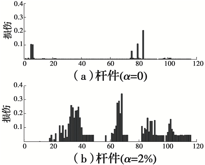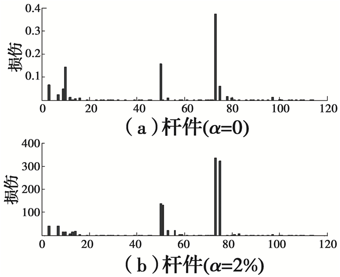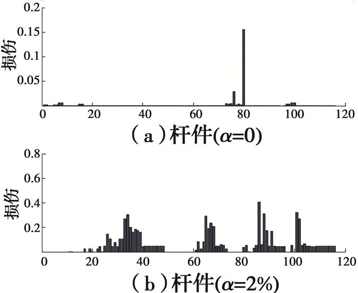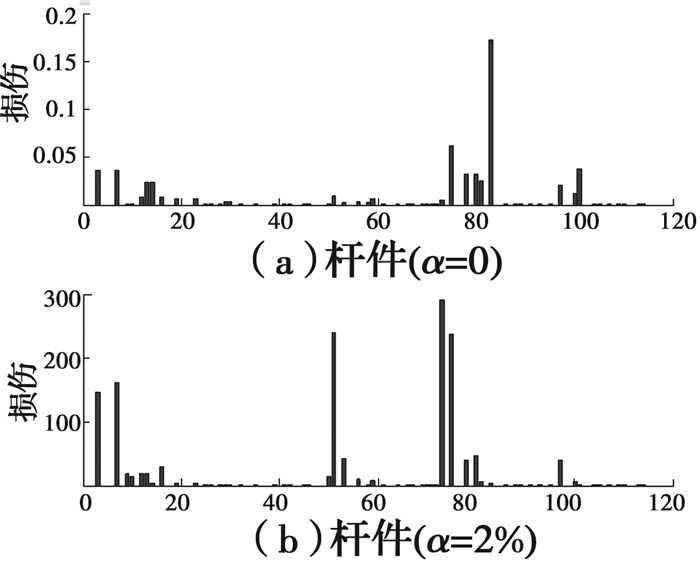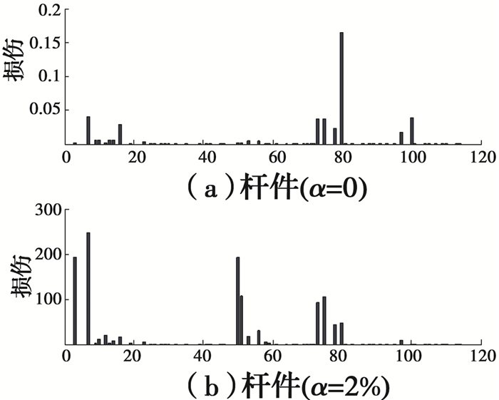 基于残余力的云推理算法的识别结果如图 10所示。由图 10可知,当噪声水平α为0时,残余力云推理算法的识别效果欠佳,其明显对杆件73和98产生了误识别现象;当噪声水平α为2%时,残余力云推理算法的识别结果虽然没有超出正常范围[0, 1],但明显地失去了损伤识别能力。说明基于残余力指标的云推理方法对于复杂塔架结构的识别效果欠佳,在考虑测量噪声时,识别结果已经完全失真。
