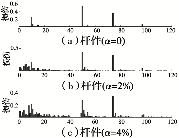 工况3为三损伤问题,杆件10、50、74均发生20%的损伤。依然采用3种方法进行损伤识别,残余力向量法的损伤识别结果如图 9所示,由图 9可知,当噪声水平α为0时,残余力向量法的识别效果欠佳,虽可以识别出杆件10和50,而对杆件74无法识别,并错误地识别出杆件73;当噪声水平α为2%时,残余力向量法的识别结果明显失真,其损伤程度已经超出正常范围[0, 1]。说明对于复杂的三维输电塔结构,残余力向量法即使在不考虑测量误差的前提下,其对于多损伤的识别效果依然欠佳,而在考虑测量噪声时,其识别结果明显失真。