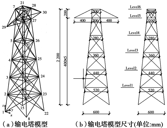 随着经济的发展和电力需求的日益增长,中国已建成多条特高压输电线路。输电塔是输电线路的重要组成部分,其在服役期间常会受到雨雪的腐蚀以及风致荷载的疲劳作用,从而造成结构的损伤和承载力下降,最终可能导致倒塌等严重事故,故有必要对输电塔等工程结构进行健康监测和损伤识别研究[1]。结构的损伤会降低结构的刚度等物理量,导致结构的动力特性也随之变化。因此,许多研究者利用损伤前后的动力特性参数进行损伤识别。常见的动力特性参数包括频率、振型、曲率模态、应变能、频率响应函数、柔度矩阵、残余力等[2-4]。频率识别技术虽然较为简单,但结构的固有频率对局部小损伤的灵敏度不高,而且其他原因也可能导致频率变化。例如Aktan等[5]的研究表明,结构在未损伤时,温度的改变也会导致频率产生大约5%的变化。结构的振型和曲率模态对损伤较为敏感[6],但高阶振型难以获取,在测量误差干扰下识别精度也难以保证。基于模态应变能和柔度矩阵的损伤识别方法,其实质依然是利用结构的模态参数为主构造相应的应变能和柔度矩阵进行损伤识别,但其对结构的高阶模态数据依赖性较小,可以利用较少的模态阶数得到较好的近似结果[7-8]。残余力向量法是直接利用结构的刚度矩阵、质量矩阵建立运动方程,并利用残余力向量与各杆件刚度变化量的对应关系进行损伤识别[9]。蔡小双等[10]将残余力向量法成功应用于桁架结构的损伤识别研究,并取得较好的识别效果。由于残余力向量法仅需要获取结构的一阶模态数据,并具有概念明确,简单快捷等优点,故具有一定的工程应用研究价值。