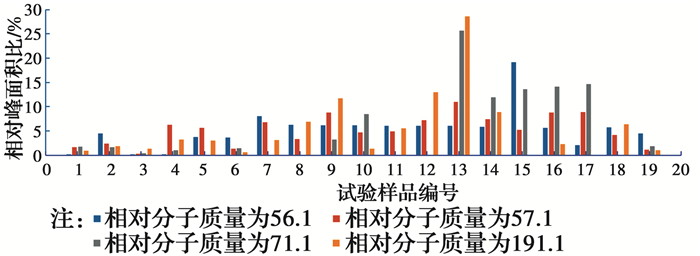 峰面积比是指在色谱图中,背景线以上部分的总面积,一般表示待测物的含量,面积越大,含量越高。选取单因素试验条件下相对分子质量分别为56.1、57.1、71.7和191.1的4种化合物为分析对象,由GC-MS所得数据,提取相对分子质量为56.1、57.1、71.7和191.1的4种化合物的峰积分面积比并计算其相对峰积分面积比。不同条件、同一时间下,4种化合物的相对峰积分面积比如图 1所示。图中试验编号19为汽油污染土的空白样(CK),试验编号1~6为以pH值为唯一变量试验组的柱状图,试验编号7~11为以含水率为唯一变量试验组的柱状图,试验编号12~13为以温度为唯一变量试验组的柱状图,试验编号14~18为以降解菌接种量为唯一变量试验组的柱状图。