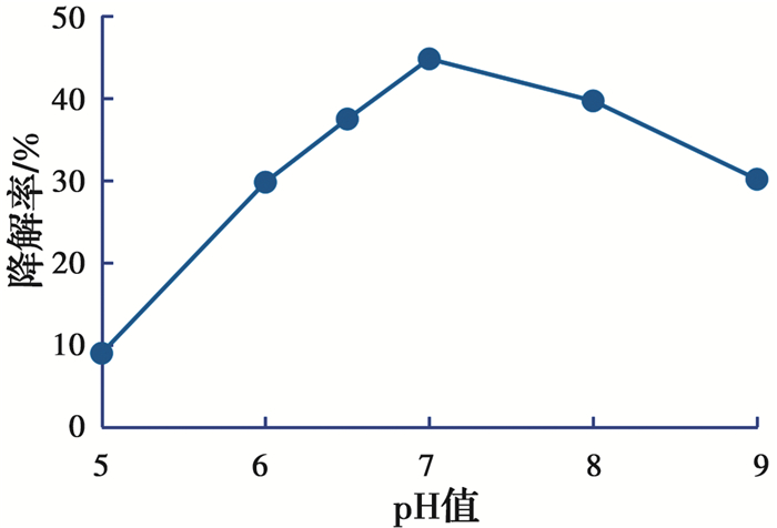 由图 2可知,混合菌悬液在pH值为7时,汽油污染土的降解率最高,为44.78%。当pH值低于或高于7时,混合菌悬液对汽油污染土的降解率均呈下降趋势,强酸情况下,降解率下降更为明显。由此可见,此混合菌悬液更适合在中性或者弱碱性环境中生存,强碱和强酸均会影响其降解能力。这是由于pH值除了与微生物的生命活动有关外,还能对环境中有机物(如营养物质和有机污染物)的离子化程度产生影响,进而间接影响微生物对汽油污染土的降解。酸性条件下,H+会影响微生物膜的结构,pH值越低,微生物的膜结构越不稳定。碱性条件下,过多的OH-会引起细胞膜上的电荷变化,阻碍细胞膜对营养物质的运输过程。此外,由于微生物对污染物的降解依赖于其产生的活性物质(酶),过多的H+和OH-均会对酶活性产生影响,阻碍其正常代谢。因此,所研究混合菌悬液的最适pH值范围为7~8,适宜在中性以及弱碱的土壤环境中生长。