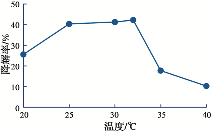 2) 温度 温度不仅影响石油烃的物理状态,还对微生物的活性以及汽油污染土的挥发性有着直接的影响。适宜的温度是混合菌悬液降解土壤汽油的重要条件。温度主要通过影响汽油的物性和微生物自身活性来影响降解过程[23]。由单因素试验得知,温度是影响所用混合降解菌降解效果的重要因素。温度对汽油污染土降解率的影响如图 3所示。