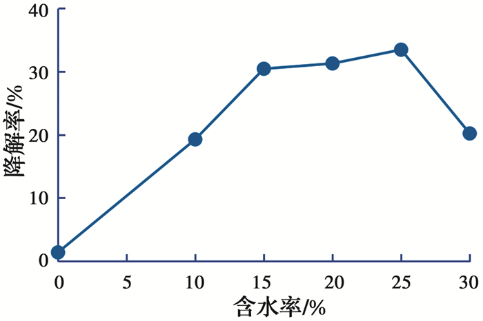 3) 含水率 土壤湿度是影响微生物降解石油烃的主要环境因素之一。微生物的新陈代谢均需要水分来维持,但湿度过高又会导致土壤空隙变小,通透性和氧气供给不足。此外,土壤中的水分会在土壤颗粒表面形成水膜,降低污染物在土壤颗粒上的吸附,增加微生物与污染物的接触几率,提高降解效率。土壤含水率对汽油污染土降解率的影响如图 4所示。