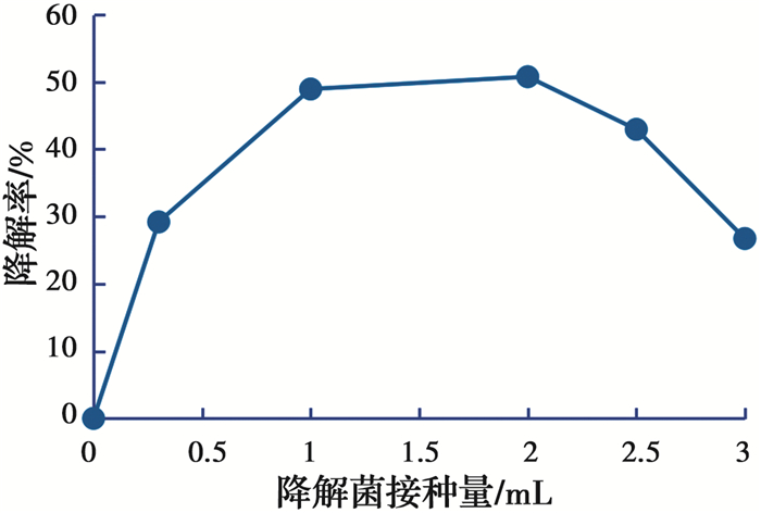 由图 5可以发现,当混合降解菌接种量为0时,汽油污染土的降解率为0,这与已有的研究结果不符,原因可能是在对未受污染的土壤进行预处理时,将土壤放于温度为105 ℃的烘干箱中烘干时,汽油污染土中的土著微生物均被高温杀死。当混合降解菌接种量为0.3 mL时,汽油污染土的降解率为29.2%,并且在混合降解菌接种量达到2 mL前,随混合降解菌接种量的不断增加,汽油污染土的降解曲线呈上升趋势。因此,若想通过微生物修复方式取得相对明显的降解效果则需要人为投放高效降解菌。当降解菌接种量在0~1 mL范围内时,随降解菌接种量逐渐增大,混合菌悬液对汽油污染土的降解率增长速率较快。但在降解菌接种量大于2 mL后,随降解菌接种量不断增大,降解率开始逐渐减小。