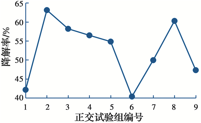 根据单因素试验结果,当pH值在6~8、降解温度在30~35 ℃、含水率在15%~25%和降解菌接种量在1~2.5 mL范围内时,混合菌悬液的降解效果相对明显。因此,选取6.5、7、8这3个pH值水平,30、32、35 ℃这3个培养温度水平,1、2、2.5 mL这3个降解菌接种量水平和15%、20%、25%这3个含水率水平作为四因素三水平正交试验的试验条件,采用L9(34)正交表安排试验方案。表 1为四因素三水平正交表及试验结果。