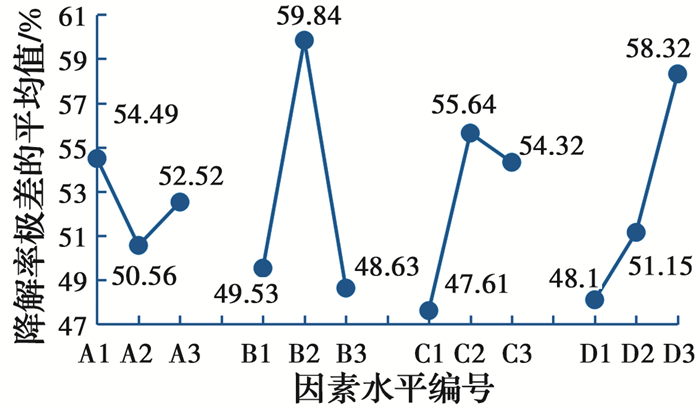 由图 6可以发现,正交试验组编号为2和8两组的降解率相对较高,均超过60%。正交试验组编号为2的降解条件为降解菌接种量为1 mL、pH值为7、降解温度为32 ℃、土壤含水率为20%,混合菌悬液对汽油污染土的降解率为63.12%;正交试验组编号为8的降解条件为降解菌接种量为2.5 mL、pH值为7、降解温度为30 ℃、土壤含水率为25%,降解率最高可达60.28%。由图 6可知,无论是温度因素还是混合降解菌接种量因素均未表现出对汽油污染土的降解率有明显的影响。因此,为了进一步比较各因素水平对汽油污染土降解率的影响水平,图 7给出了混合菌悬液对汽油污染土的降解率的极差分析图(纵坐标为降解率极差的平均值,横坐标为各个因素水平)。