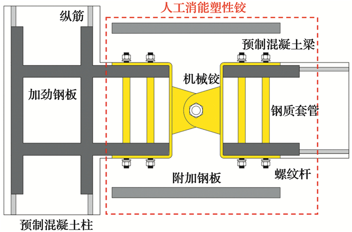 人工消能塑性铰构造是由机械铰接装置和附加钢板两部分组成,附加钢板的左右两端设有螺栓孔,同时,机械铰上下端板有对应的开孔,如图 1所示。在梁、柱构件浇筑前,预先将机械铰和端板分别与梁、柱内的纵筋网焊接固定;装配安装时,将预埋有铰接头的梁吊装至柱端对齐,完成安装,然后将附加钢板通过螺栓安装于机械铰上下。