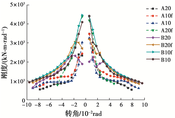由图 10可知,A类试件在转角处于±1.2%至±2.4%时退化较快,而B类试件整体刚度明显高于A类试件,且刚度退化相对平稳,在转角达到±2.4%之后,仍保持一定的抗弯刚度,可见B类试件采用冷弯折边形式的槽型钢板可有效提高刚度,减缓刚度退化速度;相较不分段开缝试件,分段开缝试件刚度略有提高,退化速度相对较慢,开缝宽度则对试件刚度退化速度影响相对较小。
