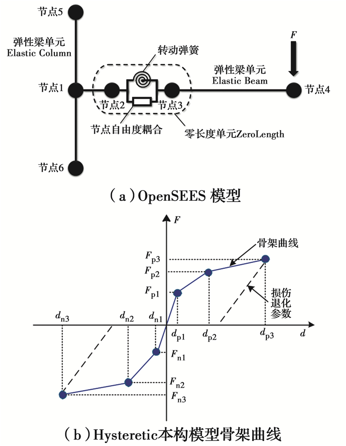 使用OpenSEES[18]软件对人工塑性铰构造建立简化有限元模型,以模拟该构造的滞回行为,为后续基于该构造的节点及框架结构模拟提供依据。图 11(a)为人工消能塑性铰模型。加载梁端及反力架柱端均采用弹性梁单元模拟,附加钢板及机械铰部分采用零长度单元Zero Length模拟,通过该零长度单元连接左、右梁单元,释放节点2与节点3加载方向的弯矩,并赋予该单元符合非线性本构及滞回准则的弯矩-转角关系,且左右节点2与节点3其余自由度均相等。
