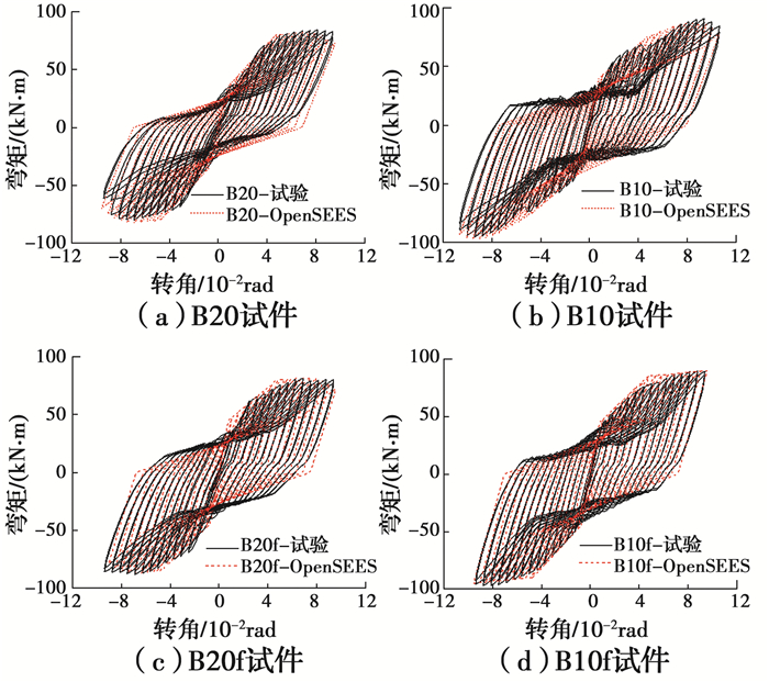 采用通过上述方法建立的OpenSEES简化模型模拟B类钢板试件的低周往复加载试验,图 12为有限元模拟结果与试验结果的滞回曲线对比。可以看出,在试件的模拟结果中,模拟的骨架曲线与试验所得骨架曲线吻合较好,其刚度退化及滑移导致的捏拢规律基本相符。可见,采用Hysteretic本构模型的零长度单元可以在宏观上较为准确地模拟人工消能塑性铰构造的滞回行为,为下一步基于该构造的装配式节点及框架结构的抗震性能分析研究提供依据。
