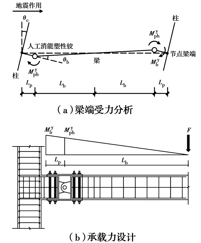 传统钢筋混凝土框架的耗能能力及延性主要依靠梁、柱构件上产生的塑性铰变形实现,在地震往复作用下,柱表面处梁上的钢筋易屈服并传递到节点核心区域,导致粘结破坏,大大降低了节点的滞回性能,容易使塑性铰丧失承载力,形成近似于理想铰的机械铰[14]。设置人工消能塑性铰,则可以避免上述问题,为保证人工消能塑性铰在地震作用下有效产生延性转动,耗散地震能量,需使其先于相邻的梁构件进入塑性状态。