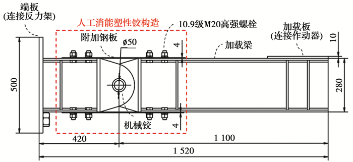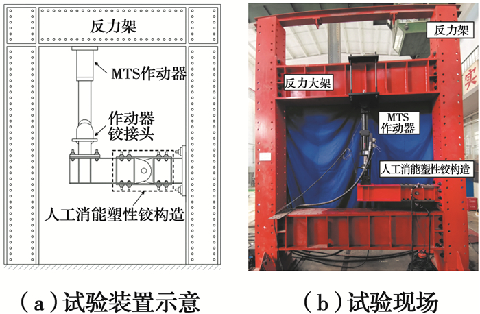 试验在青岛理工大学结构试验室进行,如图 5所示,包括反力架、人工消能塑性铰构造和竖向液压加载系统。人工消能塑性铰构造通过端板与反力架刚接,竖向作动器与加载梁连接,对构造施加低周往复荷载,加载设备为MTS-100 kN高性能线性作动器,同轴安装有LVDT位移传感器,位移范围250 mm。