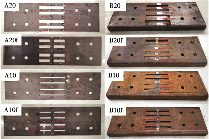 人工消能塑性铰构造采用1∶2.5缩尺,具体尺寸如图 3所示,机械铰及构造加载梁采用NM400高强度钢材制作,附加钢板采用Q235B钢材,螺栓采用M20高强螺栓。附加钢板试件共制作8组,其中A类为开缝钢板,B类为槽型开缝钢板,开缝形式分为分段开缝和不分段开缝,开缝宽度为10、20 mm,厚度为6 mm。例如,试件编号B20f表示附加钢板为槽型,中部分段开缝,缝宽度为20 mm,各个附加钢板试件如图 4所示。
