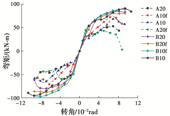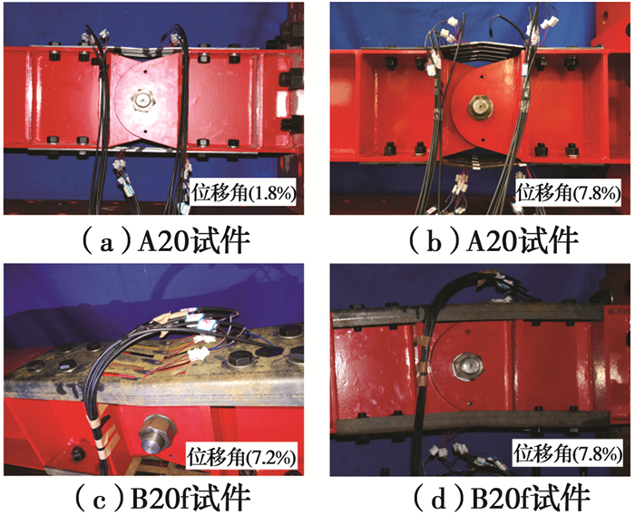 相较于A类钢板,B类钢板的承载力及抗弯刚度明显提高。以B20f为例,在前4级(±2.4%)加载过程中,未见钢板有明显变化,没有明显屈曲现象,仅在钢板开缝部分出现轻微鼓屈,持续至第12级(±7.2%)时,钢板中部开缝处出现明显屈曲,如图 6(c)所示,荷载-转角骨架曲线出现拐点,此后趋于平稳,加载至第13级(±7.8%)时,钢板中部严重屈曲,如图 6(d)所示,直至第15级(±9%)时,钢板中部开缝处有一段截面撕裂,停止加载。其中,A20f试件由于加工误差造成板材存在初始缺陷,导致该钢板负向加载时过早屈曲,荷载突然降低停止加载。其余试件试验现象大致相似,最终破坏形式均为附加钢板中部鼓曲严重导致的中部开缝位置撕裂破坏,由于篇幅限值,在此不再赘述。