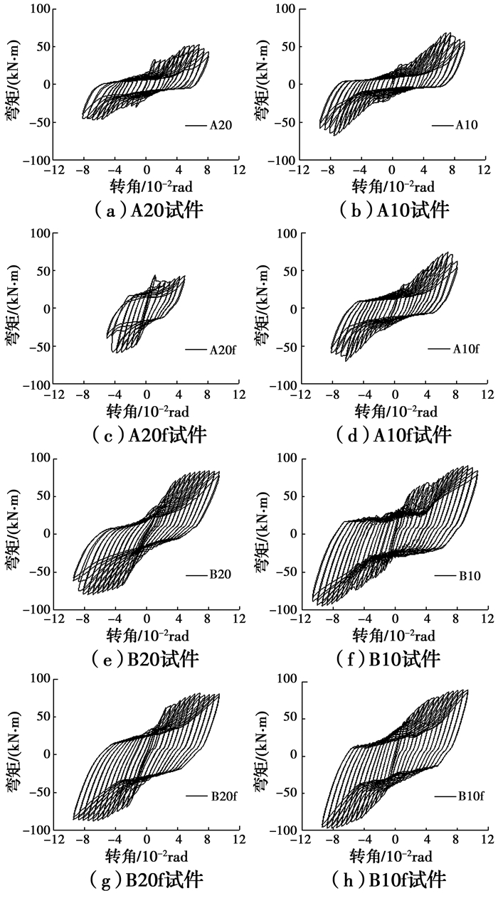 图 7为8组试件的梁端弯矩-转角滞回曲线,可见8组试件滞回曲线规律基本相似,在加载过程中均有滑移段出现,主要原因在于,往复加载过程中,附加钢板与梁接触的摩擦面不断磨损,降低了表面间的抗滑移系数。其次,螺栓与梁段孔径存在一定加工误差。