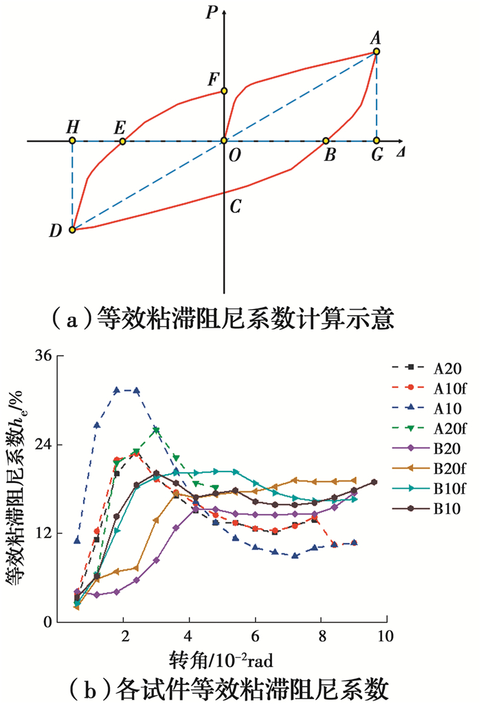 同时,采用等效粘滞阻尼系数he对附加钢板的耗能能力进行评价,等效粘滞阻尼系数he越大,表示耗能效率越高,he为某循环滞回环包围的面积与滞回环卸荷段至横坐标轴之间三角形面积之比,he计算示意如图 8(a)所示,计算如式(3)所示。