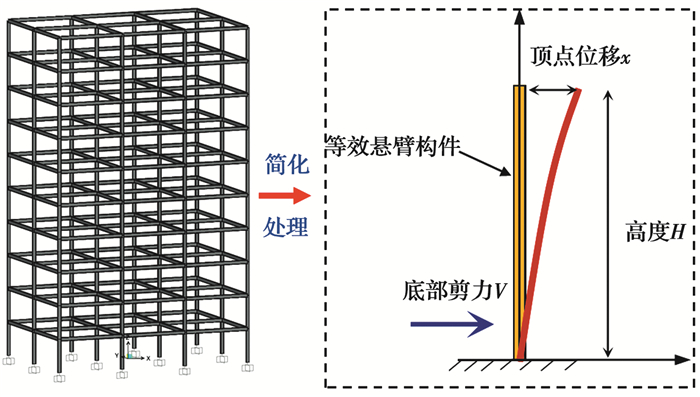为将该计算公式应用于多自由度框架体系,对多自由度框架体系参数进行简化:1)将多自由度框架体系视为一悬臂构件,如图 10所示;2)多自由度体系位移降低率采用结构顶点最大位移降低率表示;3)多自由度体系地震剪力降低率采用结构底部剪力降低率表示;4)式(11)及式(13)中的基本自振周期T采用结构相应主轴方向上的一阶自振周期,刚度Kf采用结构的整体抗侧刚度,质量m采用结构的总质量。
