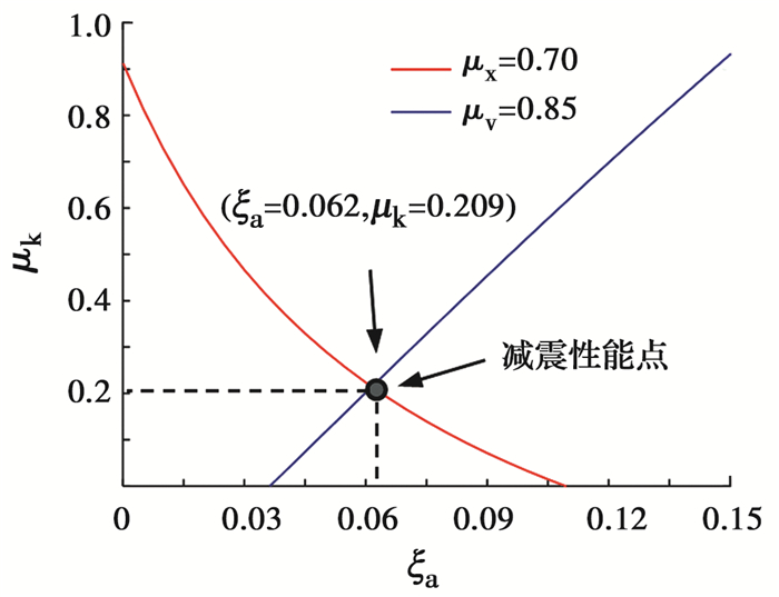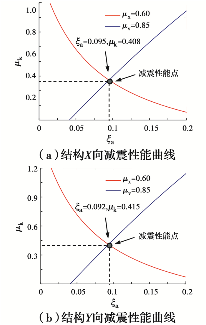 式(11)即为组合消能减震结构在特定目标位移下所需BRB提供的附加刚度及VD提供的附加阻尼比组合关系式,其中,μx为组合减震结构目标位移x2与非减震结构位移x1之比(μx=x2/x1)。当附加阻尼比ξa=0时,式(11)转化为BRB减震结构在目标位移下的刚度需求方程;当刚度比μk=0时,式(11)转化为VD减震结构在目标位移下的阻尼需求方程;当BRB设计为多遇地震屈服时,式(11)中的附加阻尼需求为BRB及VD提供附加阻尼之和,附加刚度需求为BRB屈服后提供的等效刚度(割线刚度)。