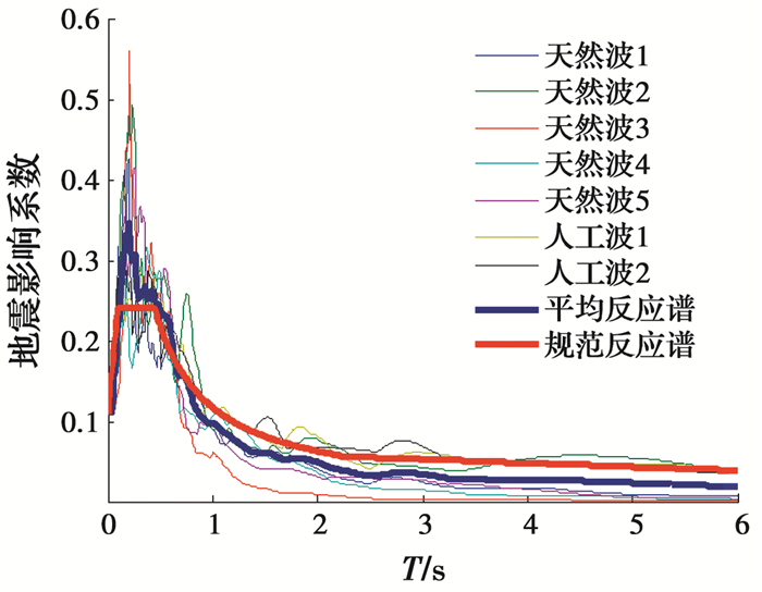 采用SAP2000软件建立组合减震结构分析模型,并根据表 4及表 5中结果输入阻尼器参数,其中BRB采用Bouc-Wen单元模拟,VD采用Damper单元模拟,按照简化方法进行阻尼器布置,见图 13,组合减震结构有限元分析模型见图 12(b)。选择符合《抗规》要求的5条天然波以及2条人工波进行时程分析,各地震波的峰值加速度调整为110 cm/s2,其反应谱曲线与规范设计反应谱的对比见图 14。通过时程分析计算结构的顶点位移降低率及底部剪力降低率,并与减震目标进行对比,从而验证文中提出的多自由度体系基于一阶振型的简化应用方法的有效性与正确性。
