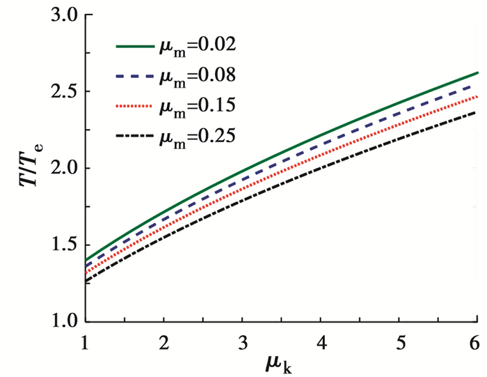 图 2为非减震结构及组合减震结构自振周期关系曲线。从图中可以看出,两结构自振周期关系随消能器附加刚度及附加质量的增加呈非线性变化,且受消能器附加刚度的影响更为显著,这说明减震结构较非减震结构在动力特性上有较大改变,即结构的地震反应有较大变化。