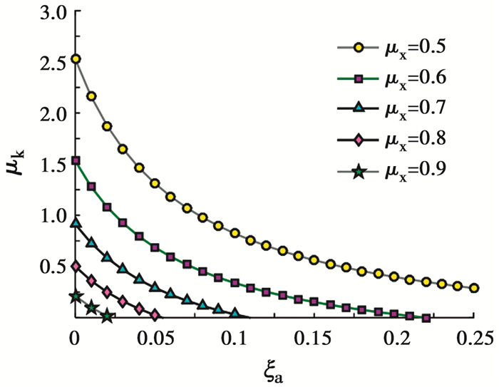 图 3为位移比μx不同取值下,刚度比μk与附加阻尼比ξa间的组合关系曲线,从图中可以看出:当结构目标位降低率一定时(即位移比μx确定时),随着VD提供附加阻尼比的增加,结构对BRB提供刚度的需求随之降低,且两者呈非线性变化关系;当VD提供的附加阻尼比较大时,随着附加阻尼比的增加,所需BRB附加刚度的变化趋于平缓;当结构附加阻尼比或附加刚度确定后,可通过图中曲线确定相应目标位移下结构所需的附加刚度或附加阻尼比;在考虑《抗规》对消能减震结构附加阻尼比上限值规定的情况下,难以通过仅附加阻尼比实现结构较小的目标位移值(例如μx=0.5时)。