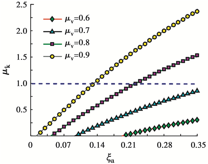 图 4为剪力比μv不同取值下,刚度比μk与附加阻尼比ξa间的组合关系曲线。从图 4可以看出:当结构目标剪力降低率一定时(即剪力比μv确定时),随着刚度比μk的增大,结构需求的附加阻尼比ξa随之增加;附加阻尼比一定时,结构剪力降低率随刚度比μk的增大而减小;当刚度比μk过大时,即BRB为结构提供较大附加刚度时,在考虑《抗规》对消能减震结构附加阻尼比上限值规定的情况下,无法通过VD提供的附加阻尼比实现结构地震剪力的降低。