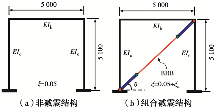 某单层钢筋混凝土框架结构如图 7(a)所示,梁截面尺寸为200 mm×400 mm,柱截面尺寸为300 mm×300 mm,梁、柱混凝土强度等级均为C30,层高为5.1 m,跨度为5 m,楼面恒载为5 kN/m2,活载为2 kN/m2,结构抗震设防烈度为8度(0.3g),设计地震分组为第二组,场地类别为I0类,场地特征周期Tg=0.25 s。结构基本性能参数及减震目标见表 1,基于设定的减震目标(位移降低目标及地震剪力降目标)采用BRB及VD组合减震方案进行结构消能减震设计。