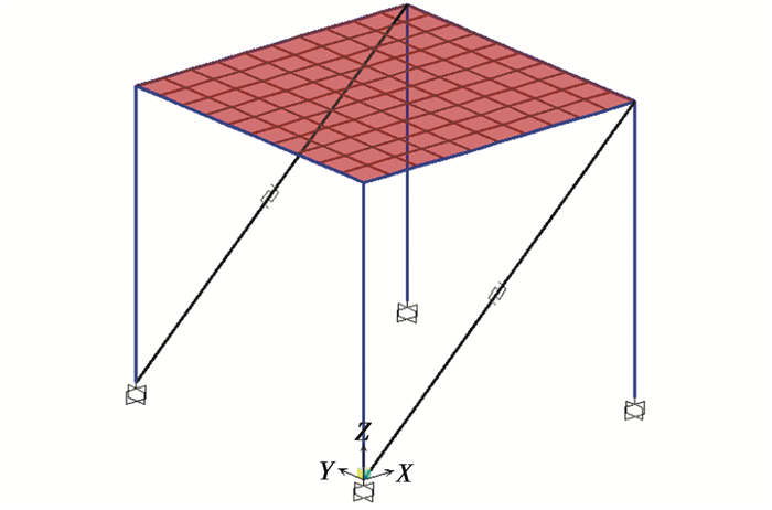 为验证算例模型采用该方法计算出的附加刚度及附加阻尼比能否实现结构的位移减震目标及地震剪力减震目标,采用SAP2000有限元软件对算例模型进行验证分析,梁、柱构件采用框架单元模拟,BRB采用塑性连接单元模拟,VD提供的附加阻尼作用通过修改结构自身的阻尼比模拟,有限元分析模型见图 9。仅以X向为例进行分析说明,其中,结构所需BRB附加的轴向刚度Kb=2 627 kN/m,所需VD附加的阻尼比ξa=0.062,即结构的总阻尼比ξ=0.112。