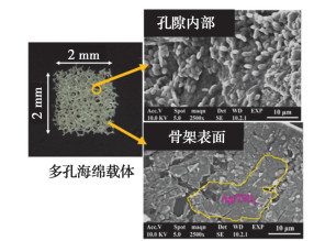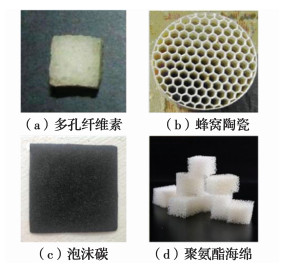 多孔载体是近场耦合体系能够运行的核心所在,高级氧化-生物降解近场耦合技术中承载生物膜和催化剂的载体一般为多孔材料,应当满足下列条件:1)具有适宜的湿密度和亲水性,能够在废水中悬浮,使废水中的有机物和营养组分,以及高级氧化产物能在其孔隙中高效传质;2)具有适宜的孔隙率,其骨架为催化剂提供足够的负载面积,其孔隙体积满足生物膜的附着空间;3)具有相当的物理与化学稳定性,在工艺长期运行过程中无显著磨损并不会被自由基氧化;4)具备理想的生物兼容性,有助于微生物膜初期附着、形成及其稳定。目前,已用于高级氧化-生物降解近场耦合技术的多孔材料有多孔纤维素、陶瓷载体、泡沫碳和聚氨酯海绵等[7, 16],如图 2所示。