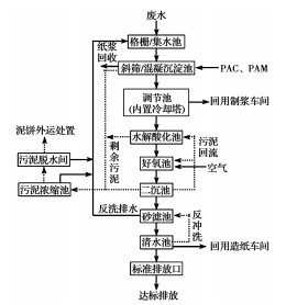 污泥脱水一般分为以下步骤[21]:1)通过重力沉降法使污泥自然下沉,待固液分离后将上清液回流至污水进水口进行集中处理,从而达到污泥增稠的目的。2)采用化学法或加热法进行污泥调理,其中以化学调理法最为常用。通过添加无机混凝剂、有机高分子絮凝剂或者两者的复配体系使污泥颗粒絮凝形成较大的絮状物,从而脱稳聚沉。加热法是同时通过加热、加压以及投加化学药剂来改善污泥的析水性能的一种污泥调理方法,可以有效地脱除胞腔水。但是,由于操作过程中能耗大,目前没有大规模应用。3)化学调理后的污泥通过机械法对其进行进一步脱水处理,一般包括离心法、过滤法、压滤法或者3种方法的任意组合。离心机、真空过滤机和带式压榨过滤机是目前最常用的机械脱水设备。其中,离心机适用于无机污泥脱水处理;真空过滤机适用于含纤维的初沉池污泥脱水处理;而带式压滤机适用于有机污泥、无机污泥和混合污泥的脱水处理。污泥脱水后的脱水液一般回流至污水进水口与原水进行统一处理,图 2为某造纸厂废水处理的工艺流程图。