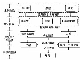 造纸污泥中含有丰富的有机质,在隔绝氧气的情况下,可以利用专性或兼性厌氧菌将污泥中的有机物分解转化成甲烷、二氧化碳以及硫化氢等气体。厌氧发酵的主要产物是沼气,沼气为可燃性气体,是一种极具应用前景的清洁能源。沼气的发热量为37 660 kJ/m3,1 kg有机质的沼气产量可达200~300 L[40]。厌氧发酵主要分为4个阶段,依次为水解阶段、酸性发酵阶段、产氢产乙酸阶段和产甲烷阶段[1]。有机物的厌氧发酵过程如图 3所示[46]。厌氧发酵的速率及效率受到诸多因素的影响,如:发酵温度、污泥龄、有机负荷、搅拌和混合速率、营养成分和C/N比、重金属含量等。其中,根据发酵温度的不同,厌氧发酵分为常温发酵、中温发酵和高温发酵3种。随着发酵温度的升高,产气率提高,污泥滞留时间短,目前最常用的为中温厌氧发酵。