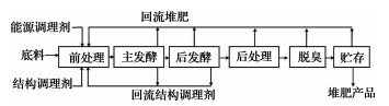 造纸污泥中含有丰富的有机质以及钾、钙、镁、铁、锌等植物营养成分,因此,利用造纸污泥为原料,通过堆肥技术进行发酵,可以生产有机肥,实现造纸污泥资源化综合利用的目的。在堆肥过程中,好氧嗜温菌和嗜热菌在适宜的温度及pH值条件下将污泥中的有机物转化成稳定的有机质,并且可以凭借堆肥过程中的高温杀死有害微生物和病原菌。根据需氧量,堆肥可以分为好氧堆肥和厌氧堆肥两种,一般常说的堆肥是指好氧堆肥技术。好氧堆肥过程包括前处理、一次发酵、二次发酵、后处理、脱臭、储存几个过程,堆肥工艺流程给如图 4所示[46]。堆肥过程受C/N比、C/P比、污泥含水率、温度、供氧情况、pH值、堆肥原料尺寸等因素的影响。造纸污泥结构致密,容易结块,因此在堆肥前一般会加入膨松剂和调理剂来改善其堆肥效率。