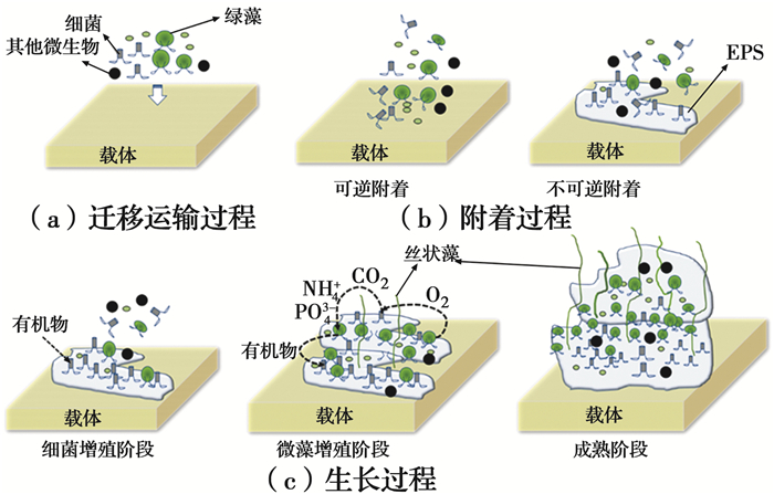 菌-藻共生生物膜的形成过程可分为3个步骤,即迁移运输、附着及生长过程[3-4, 16](具体如图 1所示)。1)迁移运输过程:菌-藻生物膜形成初期,悬浮细菌和微藻在定向吸附、重力作用、水力动力以及藻类趋光性等共同作用下,向固体介质表面运输、移动。2)附着过程:迁移至载体表面的微藻、细菌细胞与载体发生相互作用,依次进行可逆附着和不可逆附着。其中,可逆附着主要包括微生物利用鞭毛、纤毛等外部细胞器以及外层膜蛋白在载体表面发生物理性附着,由于该过程的粘附性较弱,易受外力的影响,发生脱落;不可逆附着是指初步附着的藻体和细菌通过分泌EPS,使其紧密粘附在载体表面,形成初级生物膜,不易受外界环境影响而脱落。3)生长过程:根据微生物的群落结构特征将生物膜生长过程分为细菌增殖阶段、微藻增殖阶段以及成熟阶段。细菌生长繁殖速度高于微藻,故生物膜生长初期优势种群以细菌为主,在细菌增殖阶段,细菌快速生长的同时分泌大量EPS;在微藻增殖阶段,绿藻、丝状藻以及其他藻类附着在EPS表面,同时,利用周围环境的营养物质增殖;在成熟阶段,生物膜中藻类和细菌的比例达到相对稳定状态,并形成良好的互利共生关系。最终,附着在载体表面的细菌和藻类形成一个成熟稳定、由EPS胶连,且具有三维结构的网状菌-藻共生体。