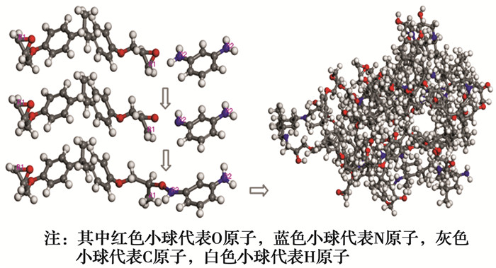 选用双酚A型环氧树脂(DGEBA)和固化剂间苯二胺(MPD)相互反应交联模拟环氧树脂模型,通过以下步骤得到交联度80%的环氧树脂模型:1)DGEBA和MPD分子进行能量最小化,在盒子中以DGEBA∶MPD=2∶1的比例放入反应物,初始密度为1.1 g/cm3;2)在NVT和NPT系统中分别采用10 ps动力学模拟降低模型内部应力,采用perl语言脚本编写程序,构建交联分子模型。当环氧基的反应原子R1和氨基的反应原子R2之间的距离接近设置值,环氧基开环与氨基反应形成新的键,具体交联过程如图 1所示;3)反应原子间半径为3.5~8 Å,反应半径以0.5 Å为间隔逐步增加,半径增加间隔中进行结构松弛;4)在反应进行到一定程度以后,包含新建的结构并不是分子最稳定的构型,采用模拟退火的方法使结构达到一个更加稳定的状态,并最终得到交联度为80.0%的环氧树脂[23]。