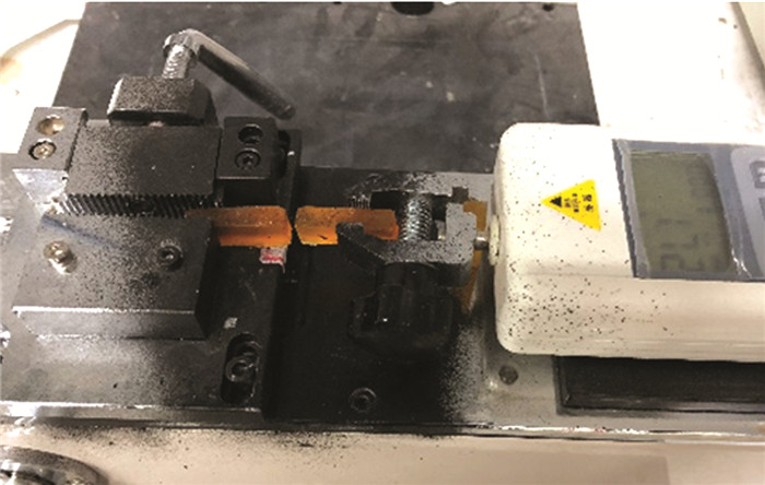 上述试样采用干燥和水浸泡方法,干燥环境为T=(20±2)℃、RH=65%的恒温恒湿室,水浸泡环境是室温蒸馏水浸泡。将蒸馏水中浸泡不同龄期的试样取出、擦干后进行纤维拔出试验。纤维拔出测试如图 13所示,两端环氧树脂块由夹头固定后,取下聚四氟乙烯膜,同时保证两端环氧树脂块严格对中,防止纤维束出现偏心受拉的情况。推动摇杆至纤维束从环氧树脂中拔出,通过超景深显微镜观测纤维束完整拔出即为有效试样,同时,记录纤维束拔出应力峰值。