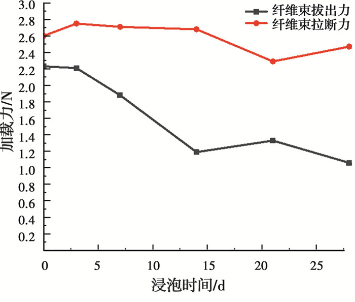 利用超景深显微镜放大100倍,观测玄武岩纤维束从环氧树脂基体的拔出及玄武岩纤维束拉断情况,结果如图 14所示。显然,纤维拔出将导致树脂基体较大范围的损伤,玄武岩纤维束上附着环氧树脂。测试玄武岩纤维束与环氧树脂基体在干燥环境下的纤维拔出力、纤维拉断时应力分别为2.23、2.6 N。玄武岩纤维束与环氧树脂基体在蒸馏水中浸泡3、7、14、21、28 d,纤维束拔出力以及纤维束拉断力变化如图 15所示。蒸馏水浸泡28 d,使纤维束拔出力从2.23 N降到1.06 N,衰减幅度达到47.53%,远大于水对玄武岩纤维束强度的影响。纤维拔出力下降的主要原因是环氧树脂吸水膨胀[28]。另外,水渗入玄武岩纤维束与树脂基质间的微裂缝,界面裂缝逐渐扩展最终导致界面粘结性能下降。