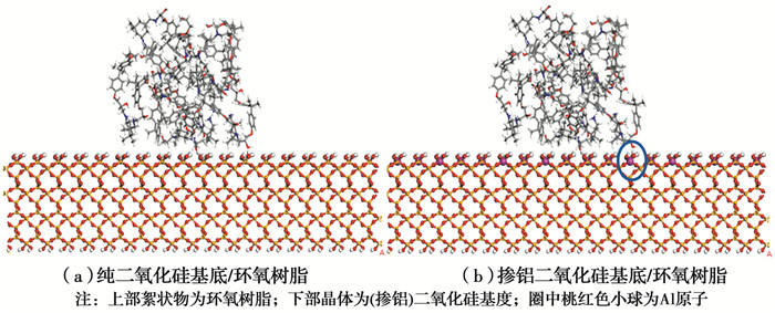 将交联度为80%的环氧树脂分别吸附到羟基处理完毕的纯二氧化硅基底、掺铝二氧化硅基底上。在环氧树脂上方添加40 Å的真空层,抵消上下两界面的相互作用。设置模拟温度为298 K,采用正则系综(NVT)进行模拟,力场选择COMPASS力场。