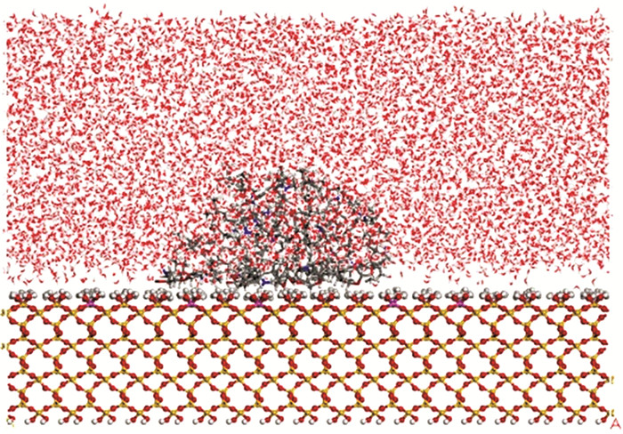 水环境界面结构模型如图 3所示,以掺铝二氧化硅基底与环氧树脂粘结完毕模型为水环境界面模型基础,在界面模型上方加入10 236个水分子,密度为1 g/cm3,模型尺寸为88.37 Å×88.37 Å×100 Å。