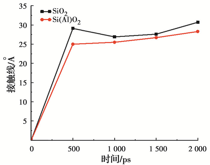 环氧树脂在二氧化硅、掺铝二氧化硅基底粘结过程如图 4所示。随着模拟步长的增加,环氧树脂逐渐靠近基底并粘附于基底。其中环氧分子与基体在粘结界面上接触面积的水平投影是接触线(如图 4绿色箭头所示)。环氧树脂在两种基底接触线变化结果如图 5所示,在二氧化硅基底中,接触线长度由0 Å变为30.7 Å,这表明环氧树脂在二氧化硅基底表面扩散并粘结。但在掺铝二氧化硅基底上,接触线长度由0 Å变为28.3 Å,这意味着环氧树脂在掺铝二氧化硅基底上的粘结长度减少,二者间粘结力弱于其与纯二氧化硅基底。